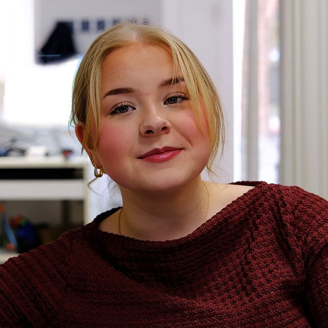 Nellie pluggar till frisör på Frisörskolan i Ängelholm och praktiserar en dag i veckan hos oss. Hon är framtidens frisör.